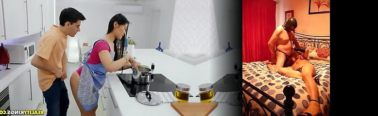 Steaming uncle's wifey in pajama Addie Andrews offers herself in the kitchen