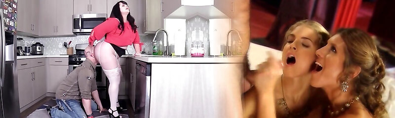 Hairy lesbians with big boobs lick cunts in the kitchen