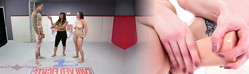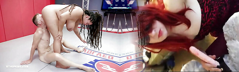 Ryan Keely nude wrestling Ariel X and winner wrecks loser with strap dildo